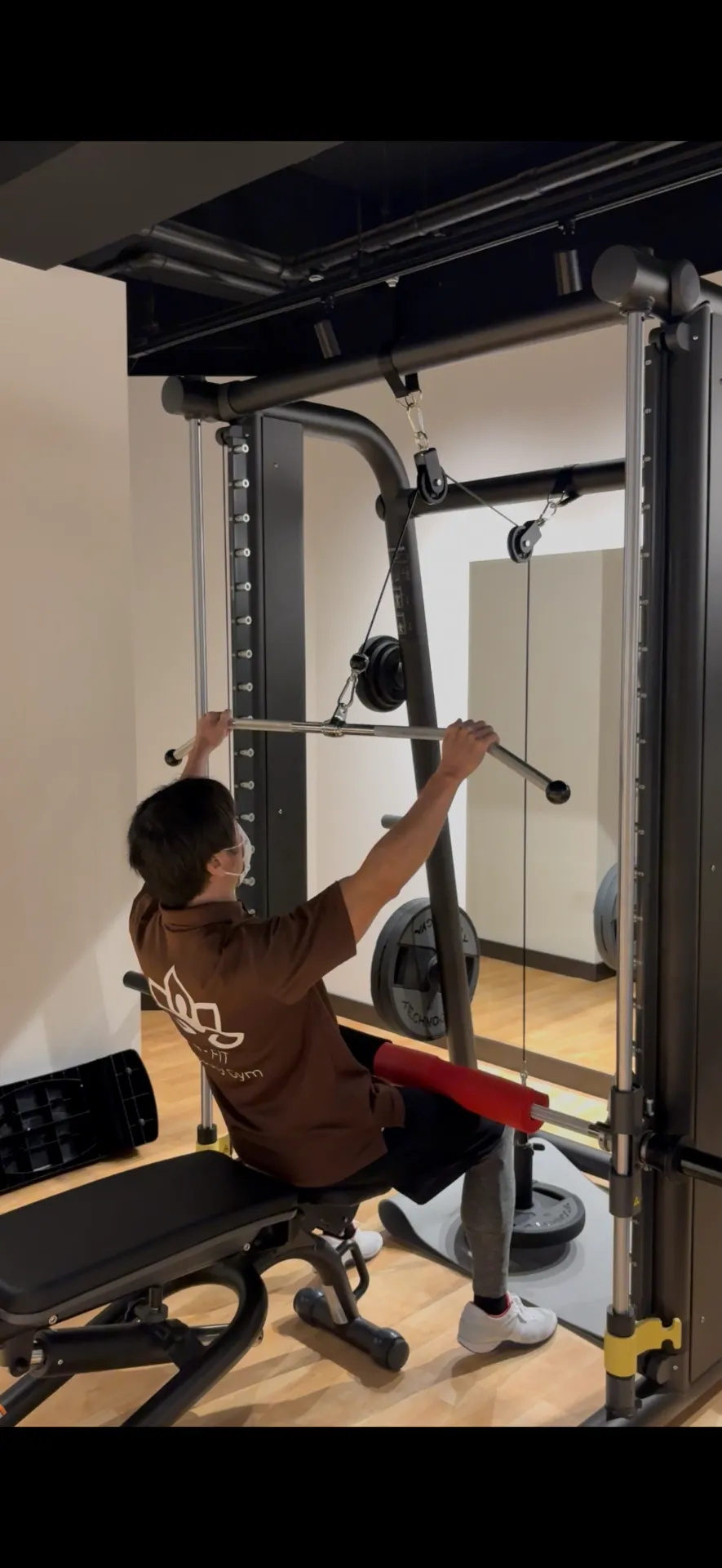 背中の筋肉に効果的な刺激を入れられるプルダウンを行なえるよう、専用プーリーをスミスマシンへ設置しました。